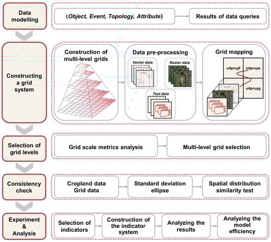 In this paper, we establish a multilevel grid system through the construction of a cropland big data fusion model. This model maps vector data, raster data, and text data into the grid. Considering the specific requirements of cropland quality evaluation, our approach involves selecting appropriate grid layers based on the quantitative and spatial characteristics of cropland patches. We also verify the spatial consistency between cropland grid data and cropland patch data. Lastly, we select a representative test area to conduct a multi-source, heterogeneous cropland big data fusion experiment to evaluate cropland quality and assess the effectiveness of our model within the study area. Figure 1 shows the research framework.
