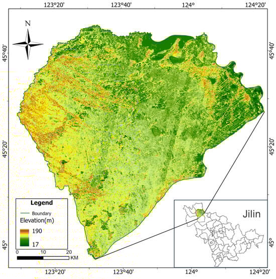 Da’an County is located in the northwestern part of Jilin Province, China, at latitude 45°52′ north and longitude 124°27′ east (as shown in Figure 2). The county is located in the hinterland of the Songnen Plain, with relatively flat terrain. The administrative area of Da’an County includes 10 towns, 5 streets and 8 townships, with a total area of about 487,859 hectares. The region has a temperate continental monsoon climate with four distinct seasons, cold and dry winters and hot and rainy summers. Meanwhile, Da’an County is one of the most important agricultural production areas in Jilin Province, and the main crops include wheat, corn, soybean and rice. The total area of cropland is about 145,750 hectares, specifically including dry cropland, paddy cropland and irrigated cropland. Among them, the type of cropland is mainly dry cropland with an area of 102,441 hectares, paddy cropland with an area of 13,457 hectares and irrigated cropland with an area of 29,852 hectares. Da’an County has rich and high-quality black soil resources, with soil rich in organic matter and nutrients and high soil quality, providing a good production base for agriculture.