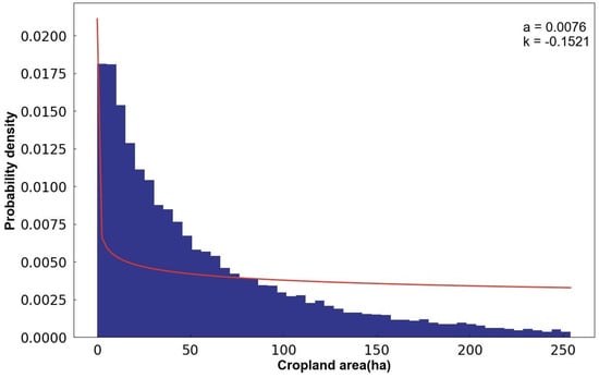 The grid scale is usually selected by considering the problems and objectives of the study area. Power law curves are used to characterize the distribution of data, especially in large-scale datasets, and could help to understand the distribution pattern of data []. In this study, a power rate curve was used to determine the grid scale, using the cropland patch areas as an indicator, fitted to a power law distribution to form a power law curve, and the scale range was determined based on the significant points of the curve.