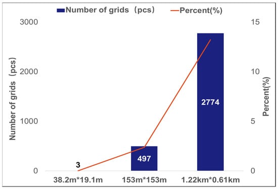 Taking into account not only the suitability of cropland patch area and grid scale but also the spatial relationship between each arable patch and the corresponding grid, we establish a basis for selecting grid cell accuracy. In our study area, there are a total of 20,983 cropland patches, with varying sizes ranging from a minimum of 1.22 × 10−4 hectares to a maximum of 812 hectares. The median patch area stands at 3.96 hectares, with an average of 6.94 hectares. In addition, the probability distribution of cropland patch areas indicates that most of them are concentrated in smaller area ranges. However, there are also some larger area values, which constitute the long-tailed part of the cropland area distribution curve shown in Figure 5.