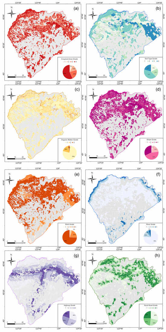 Grid data for cropland quality evaluation indicators: (a) cropland area grade, (b) soil type grade, (c) organic matter content grade, (d) slope grade, (e–h) convenience of farming grade (ditch grade, river grade, rural road grade, highway grade).