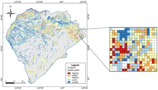 Then, the scores of each indicator layer were calculated using the results of grading and the weighting of each indicator, and the quality of cropland was calculated. Using the Fisher–Jenks algorithm [], the cropland quality score was divided into five levels to ensure that the variance between groups was maximized. The formula for calculating the quality of cropland was as follows: