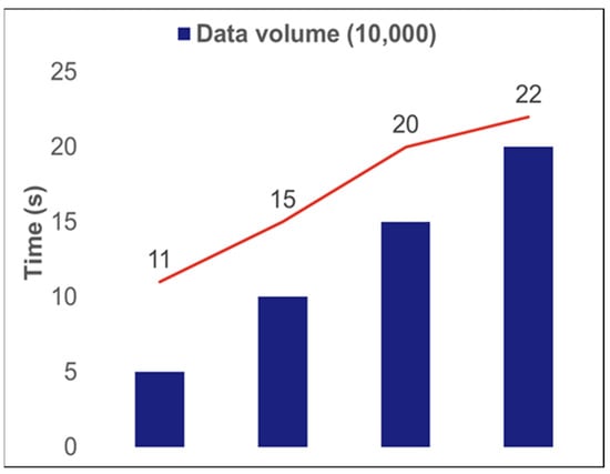 A total of about 200,000 datasets were analyzed in this study, and the grid data import efficiency was tested according to the data volume of 50,000, 100,000, 150,000 and 200,000, respectively. As could be seen from Figure 10, the time to import data increases by about one second for every 10,000 increases in data volume, which means that data volume and time consumption have a strong linear correlation. Based on this, time predictions could be made based on the amount of data to be imported. However, the efficiency of data import could also be affected by factors such as hardware configuration, the primary key design of storage tables, the frequency of data updates [], etc. This result is for reference only.
