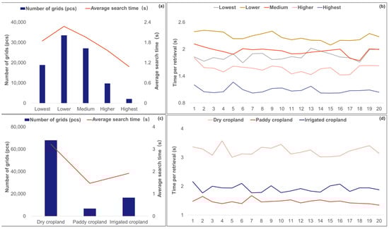 Data retrieval efficiency: (a) number of grids and average retrieval time for each grade of cropland quality, (b) retrieval time for each grade of cropland quality, (c) number of grids and average retrieval time for each cropland type, (d) retrieval time for each cropland type.