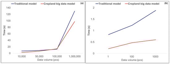 Furthermore, a comparative study was conducted between a traditional data model and the cropland big data model (as shown in Figure 12). Ten separate experiments were executed for data import and data query tasks, and the average processing time was calculated. The results demonstrate the superior data organization and management performance of the cropland big data model.