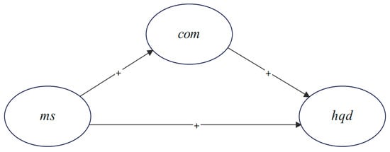 On the basis of Formula (1), the models in Formula (2) and Formula (3) are tested in turn, and the variable com measures the level of regional consumption. On the basis that the coefficient  in Formula (1) is significantly positive, if the coefficients  and  are both significantly positive, it shows that a mediated effect exists; that is, the increase in expenditure on people’s livelihood in an area can improve the consumption level of the region and then promote regional high-quality development. Furthermore, if the coefficient  is significant, it means that the level of regional consumption plays a partial mediating role, and the consumption level is only one of the channels through which people’s livelihood expenditure affects the high-quality development of the region; if the coefficient  is not significant, it means that there is a full mediating effect, and the regional consumption level is the only channel through which people’s livelihood expenditure affects regional high-quality development.
