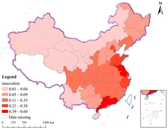 Figure 2, Figure 3, Figure 4, Figure 5 and Figure 6 show the mean value distribution of the composite index of five secondary indicators. As shown in Figure 3, the distribution of the regional innovation development level presents obvious regional differences. The top echelon consists of only two provinces, Jiangsu, and Guangdong. Beijing, Zhejiang, Shandong, and other provinces are in the second echelon, with a medium level of innovation competitiveness. The central region and coastal Fujian and northeast Liaoning are in the third echelon, indicating that more efforts are needed. However, the level of innovation development in Qinghai, Gansu, Inner Mongolia, Guangxi, and other provinces is relatively low, so it is urgent to improve the level of regional innovation development. Generally, the overall development level of innovation in China is not very high, and it shows the weakness of uneven regional distribution.