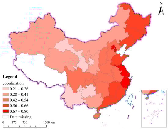 Figure 4 displays the distribution of the regional coordination development level, which generally shows ladder-like characteristics. The coordination development degree of Beijing, Jiangsu, and Zhejiang is in the first echelon. Other coastal areas and the three provinces of Heilongjiang, Jilin, and Liaoning are in the second echelon with good coordination development, while the central regions are in the third echelon with great room for improvement. The coordinated development of Yunnan, Guizhou, Gansu, and other provinces is relatively poor.