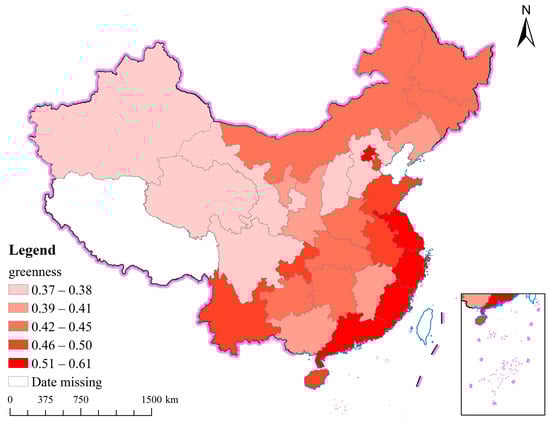 Figure 5 shows the distribution of the regional greenness development level. Beijing and the four eastern coastal provinces of Zhejiang, Jiangsu, Guangdong and Fujian are in the first tier and far ahead in greenness development. Yunnan, Chongqing, Shandong, and Anhui are in the second tier, with relatively good greenness development levels. Most of the provinces in central China and Inner Mongolia, Heilongjiang, and Jilin in northeast China are in the third echelon, with room for improvement. The poor level of greenness development in Shanxi, Sichuan, Qinghai, Gansu, and Hebei is in urgent need of attention.