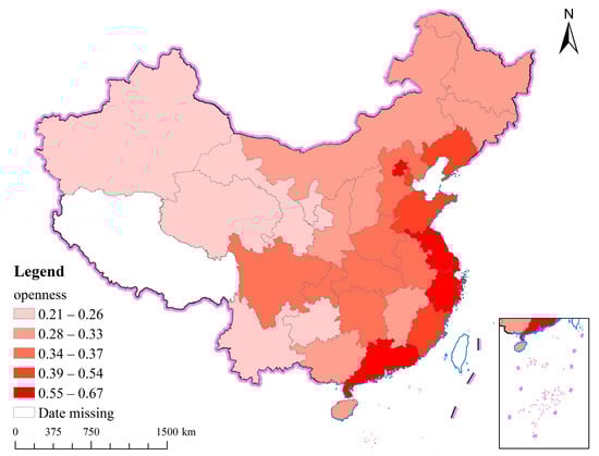 Figure 6 shows the distribution of the regional openness development level. Beijing and coastal areas are all at a relatively high level, among which Jiangsu, Guangdong, and Zhejiang are the most open. The central region is slightly less open. Yunnan, Qinghai, Gansu, Guizhou, and other regions have a very low level of openness and have extremely large room for improvement.