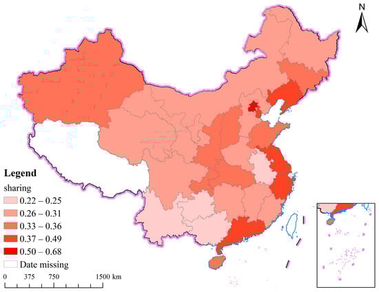 Figure 7 shows the distribution of the regional sharing development level. The provinces of Beijing, Guangdong, Jiangsu, Zhejiang, and Liaoning have a high level of sharing development, while other provinces have a relatively low degree.