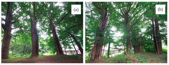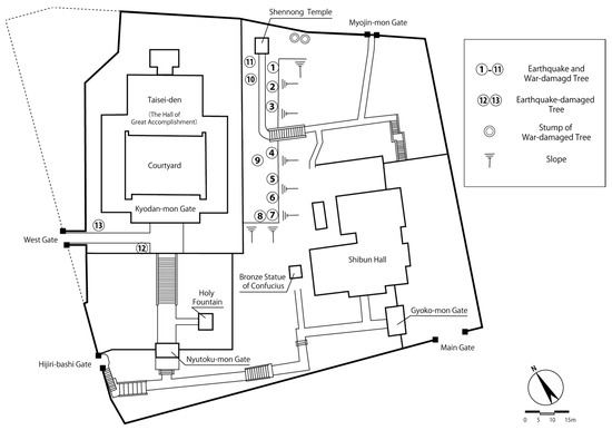 A total of 13 disaster-affected trees, affected by earthquakes and war, located within the Yushima Seido Temple in Bunkyo Ward, Tokyo, were the subjects of this study (Figure 1 and Figure 2). The Yushima Seido Temple was established in 1690 as an educational institution by Tokugawa Tsunayoshi, the fifth shogun, and in 1922, the temple grounds were designated as a national historic site. Following the Great Kanto earthquake in 1923, which resulted in a fire that consumed the entire temple except for the Nyutoku-mon Gate and the Holy Fountain, the temple underwent reconstruction in 1935, including the construction of the Taisei-den [36,37].