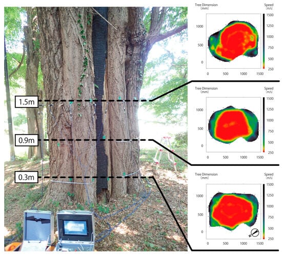 Sixteen sensors were evenly placed on the surface of the tree trunk and connected to the diagnostic device. The coordinates of each sensor were written down, and sensor checks were performed. If there were no issues with the sensor setup, a frequency of 30 kHz and a repetition of 4 cycles were set, and the measurement was initiated. Transmission started from sensor channel 1, and reception occurred at channels 2 to 16. The captured sound waves were automatically recorded in the diagnostic program on a PC. The oscillation was then repeated sequentially from sensor channel 2 to 16. The time of arrival of the received sound waves was recorded, and based on the distances between the sensors, the speed of sound between each sensor pair was calculated. The speed of sound for each mesh was displayed using geostatistical methods (Kriging). The diagnostic program’s image processing software automatically generated visualizations such as “sound speed distribution” and “analytical cross-section”. The noise deviation was set at “3”, and the detection level was set at “5”.