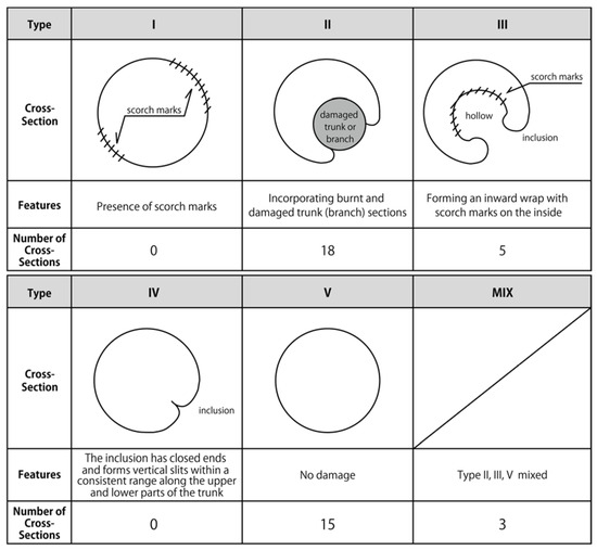 The focus of this study is not on the entire tree but specifically on the characteristics of the damage to the trunk cross-sections. The cross-sections at each measurement height were classified into five types based on previous studies [27]. When applying this classification method in this study, a new category, “Mixed Type”, was identified. The most common type in this study was Type II, followed by Type V (Figure 9).
