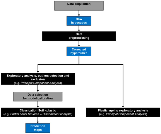 Soil samples and degraded plastics were acquired with the ImSpector TM N17E (Specim, Spectral Imaging Ltd., Oulu, Finland) hyperspectral imaging analytical device. Then, chemometric procedures were carried out for the identification of plastics in the soil and to evaluate their aging. The collected hyperspectral images were then pre-processed to attenuate noisy effects due to detector and/or scattering phenomena, remove dead pixels, and enhance spectra differences. A Principal Component Analysis (PCA) was then performed for the exploratory analysis [34] of the acquired data. Finally, Partial Least Squares—Discriminant Analysis (PLS-DA) was performed for classification purposes [35].