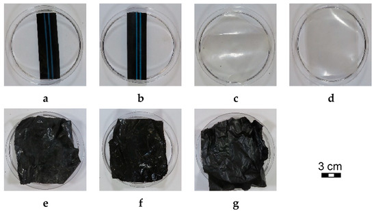 Samples of polymeric products: (a) PE—new, (b) PE—1 year of use, (c) EVA—5 years of use, (d) EVA—new, (e) PP—3 years of use, (f) PP—new, (g) biodegradable plastic—new.