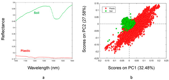 In more detail, soil spectra have absorptions at 1410 nm assignable to OH first overtones. On the other hand, plastic spectra demonstrate absorption in the second overtone of CH within the range of 1100–1220 nm [41].