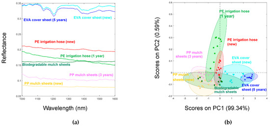 Mean raw spectra (a) and PCA score plot related to the set of polymer samples (b).