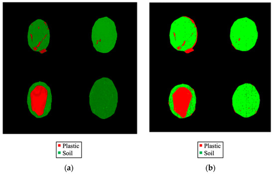 PLS-DA results are shown as prediction maps in Figure 7. Model Sensitivity, Specificity, Precision, and Error Rate are summarized in Table 1. The built model correctly distinguishes between plastic and soil. Sensitivity and Specificity for plastic are always greater than 0.92 in all three phases of the modelling. Precision for the plastic class is 0.99 in calibration and cross-validation and equal to 0.79 in prediction; on the other hand, Precision for the soil class is 0.98 in calibration, cross-validation, and prediction. Overall model Accuracy is 0.98 in calibration and cross-validation and equal to 0.95 in prediction. The obtained results are in line with previous work on MPs.