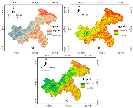 Comprehensive resistance values of PLES in Chongqing. (a) Comprehensive resistance values of production space; (b) Comprehensive resistance values of living space; (c) Comprehensive resistance values of ecological space.