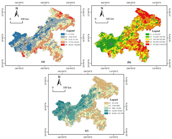 Firstly, the single-factor resistance layer is combined with different weights to generate a comprehensive resistance surface. Secondly, the “cost-distance” analysis module in the ArcGIS platform is used to select the source and the corresponding comprehensive resistance surface in the dialog box. This technique results in the generation of the minimal cumulative resistance layer for PLES. A lower minimum cumulative resistance value indicates a better spatial layout of the specific space type and a stronger function of the related PLEF. Based on the minimum cumulative resistance distance value, the production suitability, life suitability, and ecological suitability are graded as highly suitable areas (P1/L1/E1), moderately suitable areas (P2/L2/E2), generally suitable areas (P3/L3/E3), unsuitable areas (P4/L4/E4), and extremely unsuitable areas (P5/L5/E5).