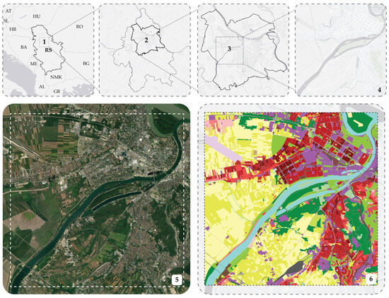 Study area (1) Republic of Serbia; (2) Regional administrative area of Belgrade; (3) Belgrade Master Plan boundaries; (4) case study boundaries; (5) aerial view of the study area; (6) case studyUrban Atlas 2012 database.