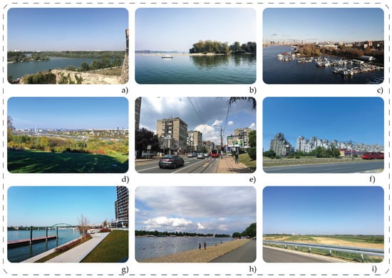 Photos of the situation (a) Confluence of the Sava and Danube Rivers; (b) The Great War Island; (c) The left bank of the Sava; (d) Košutnjak forest and panoramic view of New Belgrade, Savski Venac, Stari Grad; (e) Požeška street—CM Čukarica; (f) Blocks 61, 62, 63, and 64, New Belgrade; (g) Belgrade Waterfront; (h) Ada Ciganlija; (i) Agricultural lands of Surčin.