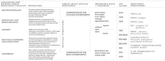 Resilience is a measure of the system’s capacity to absorb change, and some ecosystems are more resilient than others [4]. Although the concept of resilience is related to the ecological aspect of analyzing and assessing the state of the ecosystem [5], it appeared in landscape management in the 1990s [6,7,8]. The concept of resilience is comprehensive and complex, which complicates and challenges its application to contemporary urban planning and design [9]. Nevertheless, measuring urban resilience is necessary in order to operationalize the concept into a more normative approach to urban planning that shifts from a pure descriptive/analytical assessment to defining a spatial support system that aids system transformation in a long-term and co-evolutive manner [10].