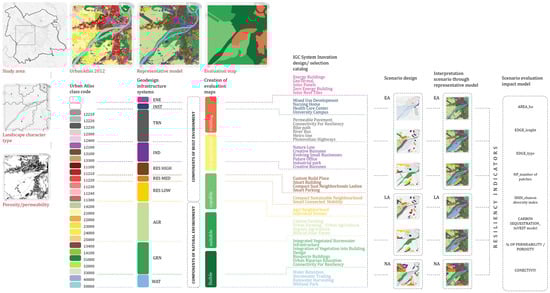 According to Steinitz’s model of landscape planning, the scenarios developed during the IGC (EA, LA, and NA) were assessed using indicators of resilience (Table 2). For each indicator, metric parameters were selected to measure changes in the components of the built environment (TRN, RES HIGH, RES MED, RES LOW, ENE, IND INST) and natural environment (WAT, AGR, GRN) (Table 2).