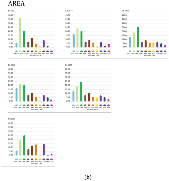 The analysis of the components of natural environment connectivity shows a higher level as the scenario evolves from EA2022 to EA2050 and as the patches develop in number and area. In addition, new innovations are introduced, such as connectivity for resilience, floating wetland parks, and water retention for connecting the patches of GRN infrastructural systems across and with AGR and WAT systems. The model created to analyze connectivity results for components of the natural environment (Figure 12) includes components of the built environment that contain more than 50% of green area within their structure (RES LOW and RES MED). They were combined with infrastructure systems WAT, GRN, and AGR, and the results showed that most components of the natural environment are located within 0–400 m and 400–1000 m of RES LOW and RES MED infrastructure systems, respectively. This analysis shows that the level of connectivity increases in the development scenarios for EA and LA.