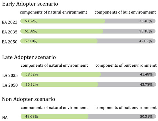 The number of patches within the components of the natural environment gradually increases in the EA and LA scenarios, indicating the addition of new patches of infrastructural systems and innovations. The number of patches within the components of the built environment is higher but decreases from the representative model toward the developed scenarios. Limitations in detecting prior innovations could affect the accuracy of these results. The results show a gradual increase in the number of patches within the components of the natural environment in the EA scenario: NP = 525 (2022), NP = 616 (2035), slightly declining in the EA 2050 (NP = 591) due to the implementation and combinations of innovations such as organic agriculture, carbon farming, urban farming, rainwater harvesting, floating wetland parks, water retention, and connectivity for resilience. Similar trends can be seen in LA: NP = 594 (2035) and NP = 587 (2050). The NA scenario has the lowest patch count: NP = 486 (Table 2). The components of the built environment show higher levels than components of the natural environment in a number of patches, but the area of individual patches is smaller in size. The patch count results decrease from the representative model to EA 2050 (NP = 1634), LA 2050 (NP = 1573), and NA 2050 (NP = 1454). The model needs upgrading to recognize innovations adopted earlier so that the results are correct in terms of multifunctionality, redundancy, modularization, and diversity (Table 2).