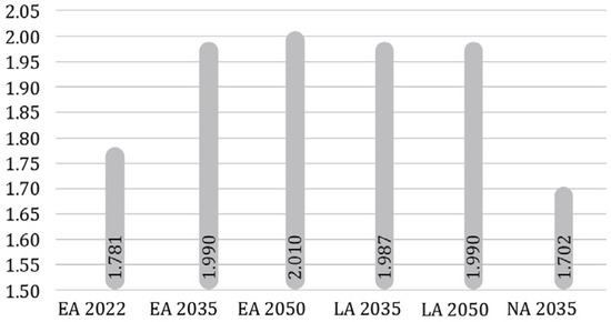 Diversity analysis was performed using the Shannon diversity index (SHDI) metric, which shows the gradually increasing level of landscape structure multifunctionality within different scenario designs, with higher diversity corresponding to higher multifunctionality due to the implementation of new innovations and their broad spatial distribution. Higher diversity corresponds to higher multifunctionality, resulting from the implementation of new innovations: organic agriculture, carbon farming, urban farming, rainwater harvesting, floating wetland parks, water retention, mixed use, compact sustainable neighborhoods, agriculture neighborhoods, individual housing, nursing homes, health centers, solar panels, bifacial solar farms, creative businesses, and industrial parks. For the EA and LA scenarios, the diversity levels are similar and go from the year 2022 with SHDI = 1.781, which increases the structural diversity, to the years EA2050 SHDI = 2.010 and LA2050 SHDI = 1.9907, while the lowest level of diversity is associated with the NA2050 scenario with SHDI = 1 (Table 2 and Figure 8).