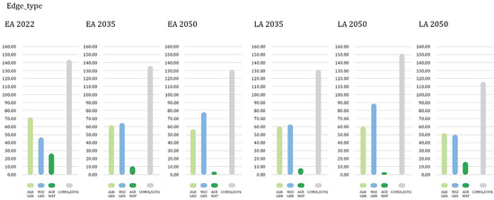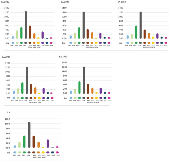 The total edge length of the natural environment components decreases from EA2022 to EA2050 in the developed scenario, followed by LA2050 and NA2050 (Table 2, Figure 10). These changes in the total edge length are caused by urban development and the introduction of innovations in infrastructure systems such as RES MED, RES LOW, ENE, INST, etc.