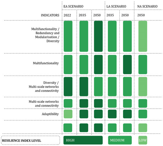 The operationalization of the resilience index includes a representation of the overall resilience of the landscape across different scenarios (Figure 13). This shows how the dynamic evolution of resilience trends changes over time, reflecting various/different development trajectories, including EA, LA, and NA. The summary of changes/alterations in parameter values in Table 1 provides valuable insights into shifts in key resilience indicators (Figure 13). Parameter values were scored and categorized into a three-tiered scale: high, medium, and low, allowing for interpretation of the resilience index.