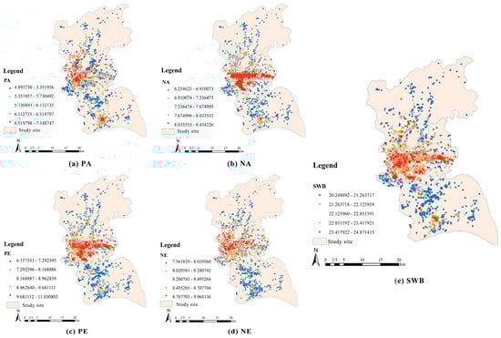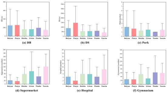- Destination accessibility: This study used the number of public facilities within the 1 km buffer zone of the community to assess accessibility [26,30]. Many studies have confirmed that the public service facilities around the community are an important factor affecting the health of the elderly and are involved in their daily life [38]. These activities encompass not only aspects intrinsic to the residential life, but also those relevant to activities such as shopping, socializing, physical exercise, and medical care [41]. Aligned with the lifestyle of the elderly, this study selected supermarkets, parks, hospitals, and gymnasiums, calculating the number of these facilities within the community’s 1 km buffer zone.
