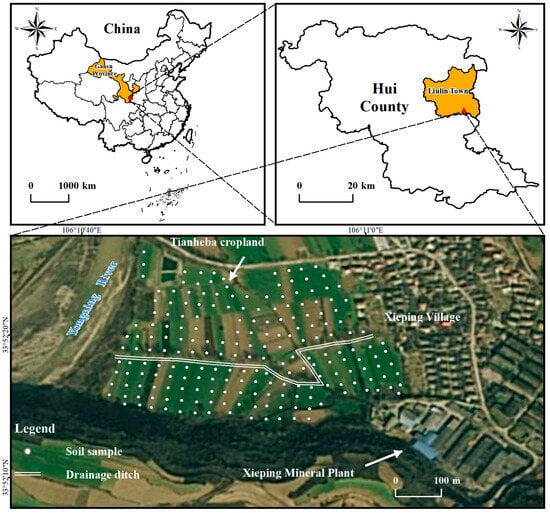 The study area of this investigation is the Tianheba cropland, which is bounded by 106°10′06″ E to 106°11′13″ E longitude and 33°51′46″ N to 33°52′28″ N latitude; it is situated in Liulin Township (Figure 1) and has an area of approximately 0.15 km2. It is connected to Xieping Village in the east, the left bank of the Yongning River in the west, the country road leading to Xieping Village in the north, and the Loess Plateau in the south. In Groups I and II of Xieping Village, roughly 600 people from 200 households own the loess-based land, which is primarily used for growing soybeans, vegetables, corn, wheat, and nurseries. The Xieping lead–zinc ore dressing plant is adjacent to the southern part of Xieping village; it had an industrial wastewater discharge of about 30 × 104 m3/a from 1994 to 2008 and was closed in 2012 in accordance with the law. Due to the terrain, industrial wastewater is discharged into the Yongning River from the east to the west along the main ditch between the Tianheba croplands, which divides the cropland into two major farming areas, north and south.