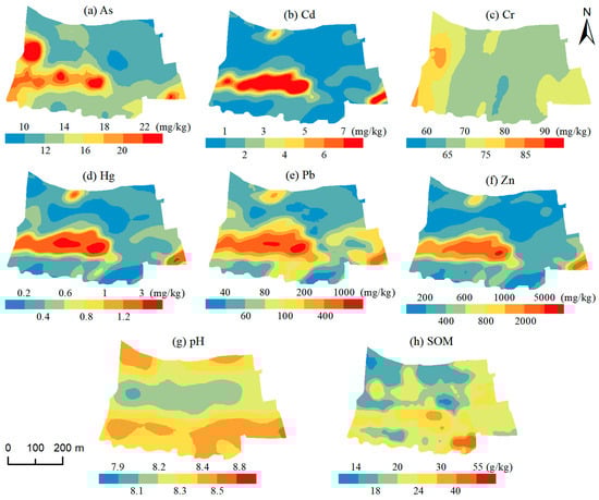 The spatial distribution of the heavy metals and soil properties (pH and SOM) in the Tianheba cropland is shown in Figure 2. The pH levels were found to be high on both the north and south sides of the cropland, and the value decreased toward the middle of the cropland. On the other hand, the SOM content exhibited a decrease from the southeast to the northwest direction. The As, Cd, Hg, Pb, and Zn distribution characteristics were essentially the same, with the high-value areas clustered near the ore dressing plant and near the drainage ditch between the residential area of the Xieping Village and the Yongning River, and the heavy metal contents in the northeastern part of the country were less. This is mainly related to the topography of the cropland and the distribution of the drainage canals. Most of the western part of the Tianheba cropland is relatively flat; the direction of the surface runoff and drainage canal water flow direction are the same, from east to west, and the hydraulic gradient is only 10~20‰. Heavy metals enter with the wastewater through the drainage canals, and the drainage canals diffuse the heavy metals, resulting in heavy metal enrichment. The areas with high Cr content are mainly distributed near the ore dressing plant and the bank of the Yongning River; the soil heavy metal aggregation near the drainage channel is not obvious. The areas with a high As content are also mainly on both sides of the Yongning River, but there are fewer of them near the ore dressing plant; on the whole, the area is not highly contaminated with these two kinds of heavy metals. The contents of these heavy metals may be highly correlated with the topography; the heavy metals are aggregated with the rainfall, surface runoff, etc., in the low place. There is a small amount of heavy metal enrichment in the northern part of the cultivated area, which may be due to the fact that no effective soil pollution control measures were taken before this; so, the soil pollution is subject to large variations in the micro-topographic terrain, and localized heavy metal enrichment has been formed in the low-lying areas.