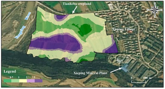 where Igeo is the index of geoaccumulation; Cn is the measured content of heavy metal n; K is the correction factor considering the degree of variability of the geological background value, which is taken here to be 1.5; and Bn is the background reference value of heavy metal n. In this paper, we selected the background values of the soils in Gansu Province and the Tianheba cropland, respectively. The grading criteria for evaluating the degree of soil heavy metal accumulation were as follows: Igeo < 0 for no pollution; 0 ≤ Igeo < 1 for mild pollution; 1 ≤ Igeo < 2 for moderate pollution; 2 ≤ Igeo < 3 for medium-strength pollution; 3 ≤ Igeo < 4 for strong pollution; 4 ≤ Igeo < 5 for strong–extremely strong pollution; and Igeo ≥ 5 for extremely strong pollution [27].