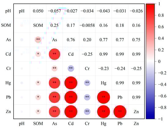 The relationship between the soil heavy metal content and the soil physicochemical properties is a result of their interaction with the environmental conditions of the soil, which determine the toxicity of the soil and affect the heavy metal content [4]. The heavy metal contents in the soils of the study area were all negatively correlated and non-significantly correlated with pH, indicating that pH fluctuations in the study area do not affect the migration and aggregation of heavy metals in the soils but are the result of various factors such as mining area, acidic drainage, and soil environment; the relationship between the heavy metal contents and pH may be limited by the soil environment [39,40]. Therefore, pH is not used as a factor in the subsequent analysis of heavy metal sources. With the exception of Cr, the rest of the heavy metals showed a significant positive or a highly significant positive correlation with the SOM, which may be attributable to the fact that the soil organic matter has a good adsorption effect [39].