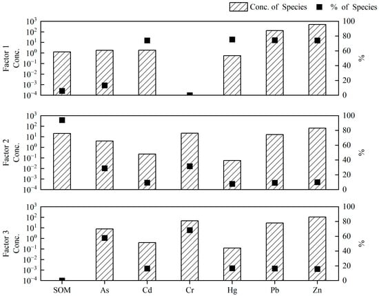 The sources of soil heavy metals are generally the soil-forming parent material and human activities [41]. By analyzing the possible local sources, the number of factors, from two to four, was chosen, and twenty iterations of the operations were performed, respectively. It was found that the simulation was best when the number of factors was three; the 10th result in the model operation was the best. The values of QRobust and Qtrue were 1349.9 and 1431.7, respectively, with a difference of 10% or less, and most of the residuals of the samples were in the range of −3 to 3, which indicated that it had good feasibility. The R2 values of the fit for Zn, As, Cd, Cr, Hg, Pb, and SOM were 0.99, 0.82, 0.99, 0.70, 0.99, 0.99, 0.99, and 0.99, respectively, indicating a good fit.