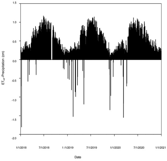 Reference evapotranspiration (ETref) minus precipitation throughout the three-year study (cm).