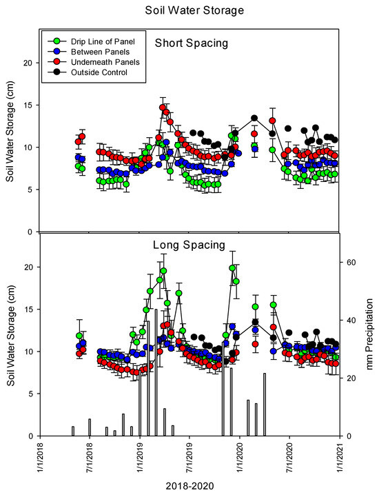 The soil water in storage measured biweekly at different locations throughout the solar photovoltaic facility. Vertical bars indicate precipitation events.