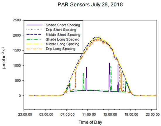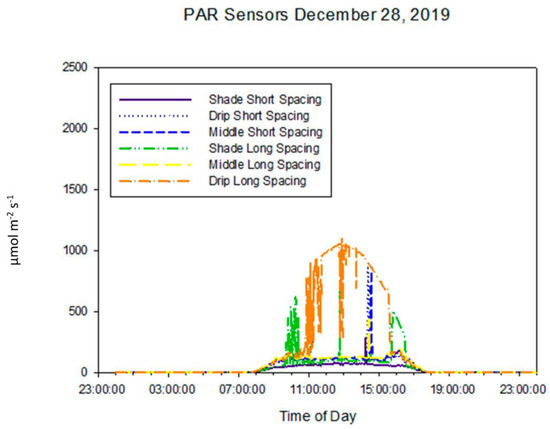 In the solar facility, photosynthetically active radiation (PAR) sensors were placed on the soil surface at the drip line, underneath the panel, and between the panels in both the long and short spacing. Panels were spaced in such a way that one row of panels would not shade the next row of panels. Without an outside control sensor (vandalism), the long-spacing drip sensor was used to compare the other locations since there was no panel shading and no panel reflection at that location. The panels were approximately 100 cm above the soil surface but varied according to the topography, with an average soil slope of 9.0% (Table 2). The PAR in the long spacing was similar at the drip line of the solar panels and between the panels (p = 0.98) but revealed an 83–85% reduction under the panels, which was statistically different from all other locations (Table 3, p < 0.001). The amount of sunlight that reached the ground varied on an hourly basis and by time of year (Figure 3 and Figure 4) and by panel row position. PAR values at midday reached 1000 µmol m−2s−1 near the winter solstice but approached 2000 µmol m−2s−1 near the summer solstice. Deviations in the hourly PAR values (not including the shade location) occurred during the morning and early evening hours. Well-defined spikes in PAR occurred throughout the day, reflecting light penetration between the panel mounts.