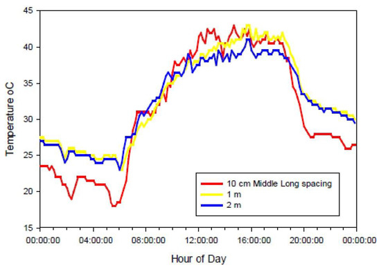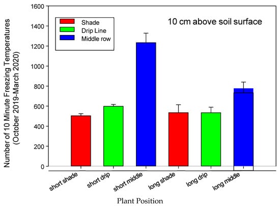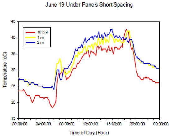 Within the solar facility, air temperature was assessed using i-buttons at 10 cm, 1 m, and 2 m heights. The i-button data set revealed significant temperature differences between the 2 m and 10 cm heights at the long and short spacing locations (p < 0.05). Underneath the panels in the short spacing, the 2 m i-buttons recorded temperatures as much as 6 °C higher than at the 10 cm height during midday (June, p < 0.001, Figure 5), whereas at the middle location, temperatures were as much as 5 °C higher at the 10 cm i-button height compared with the 2 m height at midday (p < 0.001, Figure 6). These higher temperatures at the 2 m height under the solar panels were directly related to the solar panels radiating heat from the underside of the panels (sensible heat). The temperatures of the surface of the top of the panels averaged 7.9 °C lower than the temperature of the surface of the bottom of the panels (p < 0.001. Figure 7). The soil temperatures taken at the drip line were as much as 25 °C cooler than the temperatures at the bottom of the panels (winter, p < 0.001). The panels also warmed the air during the winter (October to March), generating fewer freezing temperatures associated with the panels at the 10 cm height than at the middle row locations (p < 0.001, Figure 8). Such warmer temperatures in closer contact with the panels provided reduced freezing conditions for both plant species during the winter months.