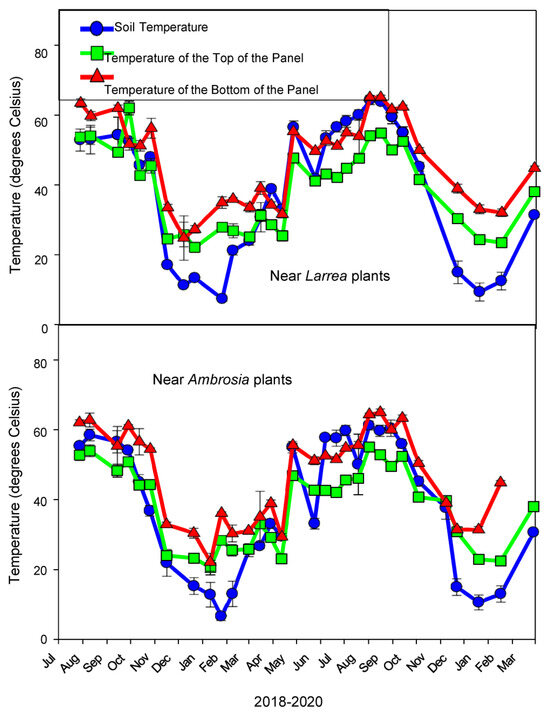 Marrou et al. [35], reported higher plant canopy temperatures during the morning in their solar array shaded treatments compared with outside controls. The higher temperatures in the shade in the winter in our study were associated with heat and longwave radiation that was transferred from the underside of the panels to the ambient air and soil surface underneath the panels, driving higher air temperatures. The average lower surface panel temperatures were 7.9 °C warmer than the upper surface panel temperatures. Other studies [52] have quantified that as much as 63% of incoming solar energy is transmitted through the panels, and this energy can be moved into adjacent plant communities [13,28].