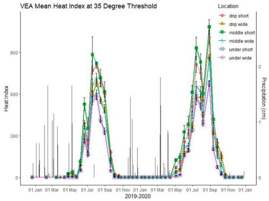 The heat index was determined using i-buttons (Maxim Integrated, San Jose, CA, USA) at heights of 10 cm and 1 m, capturing the general height of the plants. The temperatures from each of these i-buttons were averaged on an hourly basis from ten-minute readings. This average temperature had 35 °C subtracted from it as a threshold. ((Air temperature at 10 cm − 35 degrees) + (air temperature at 1 m − 35 degrees)). The index was also assessed with thresholds of 25 °C and 30 °C but found greater statistical separation at 35 °C. Only positive values were considered in the calculations. The data were then summed for 24 h, divided by two, and multiplied each day by the ETref-Precipitation of that day. The values for each day were then summed for two weeks, only positive values were accepted, and the area under the curve (AUC) was found for the two-year data sets.