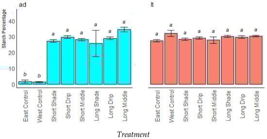 Ambrosia dumosa (ad) and Larrea tridentata (lt) starch content of both stems and roots combined inside the solar facility at various locations and outside the facility at the control sites. Letters denote significant differences at the p < 0.05 level.