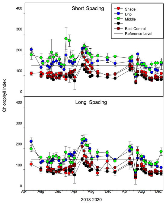 The Marrou et al. study [35] reported higher temperatures under the panels at night but lower mean daytime temperatures in the shade. The heat index in our study showed that temperatures in the short spacing, especially between the panels, were hotter than those in other locations in the facility (p < 0.001).