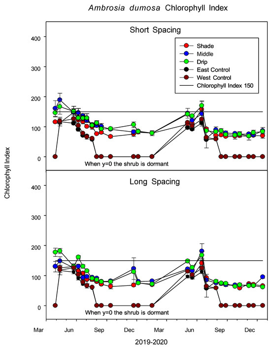 Chlorophyll index values for L. tridentata in August 2019–January 2020 inside the facility were significantly higher than the east and west control plants (p-value < 0.001), except in the short spacing underneath the panels (Figure 11). Low light under the panels may have altered the readings; (under controlled conditions we measured a 6% increase in values on plants growing in the shade vs. the same plants in direct light) we report the values with this limitation. During the winter months, L. tridentata inside the facility appeared greener (Figure 12), whereas outside the facility, plants lost most of their spring green color, and the leaves appeared brown in color. This was reflected in the chlorophyll index that was measured (Figure 11). Few L. tridentata chlorophyll index values of control plants or shade plants exceeded 150, which was chosen as a reference level. In contrast, plants near the drip line or in the middle row positions had values consistently over 150. Ambrosia dumosa plants outside the facility were dormant during the winter and did not possess leaves during this period (Figure 13). Ambrosia has a lighter color green and only reached chlorophyll index values of 150 during spring. Ambrosia dumosa east and west control plants had chlorophyll index values that were significantly lower during the summer of 2019 than at all other locations (p-value < 0.001). A. dumosa chlorophyll index values (Figure 14) measured between panel rows and at the drip position in the short and long spacing, were significantly higher than values measured on plants underneath the panels (June–December 2019, p < 0.05).
