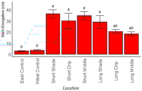 Growth of stems of Larrea tridentata over the two-year monitoring period separated by panel spacing and plant position. All plants inside the facility had significantly more stem elongation than the control plants, except for long drip and long middle (p < 0.001). Letters denote significant differences at the p < 0.05 level.